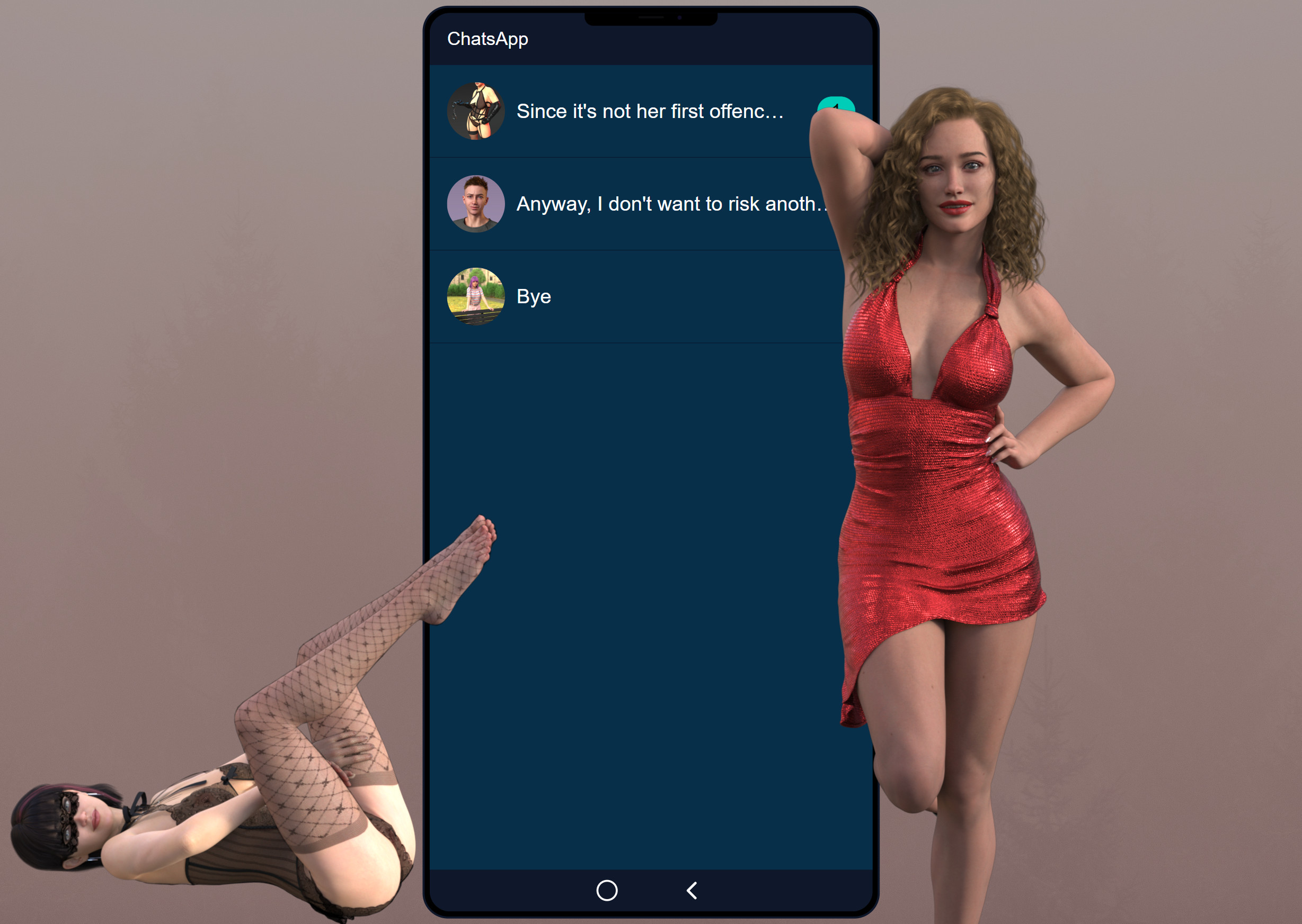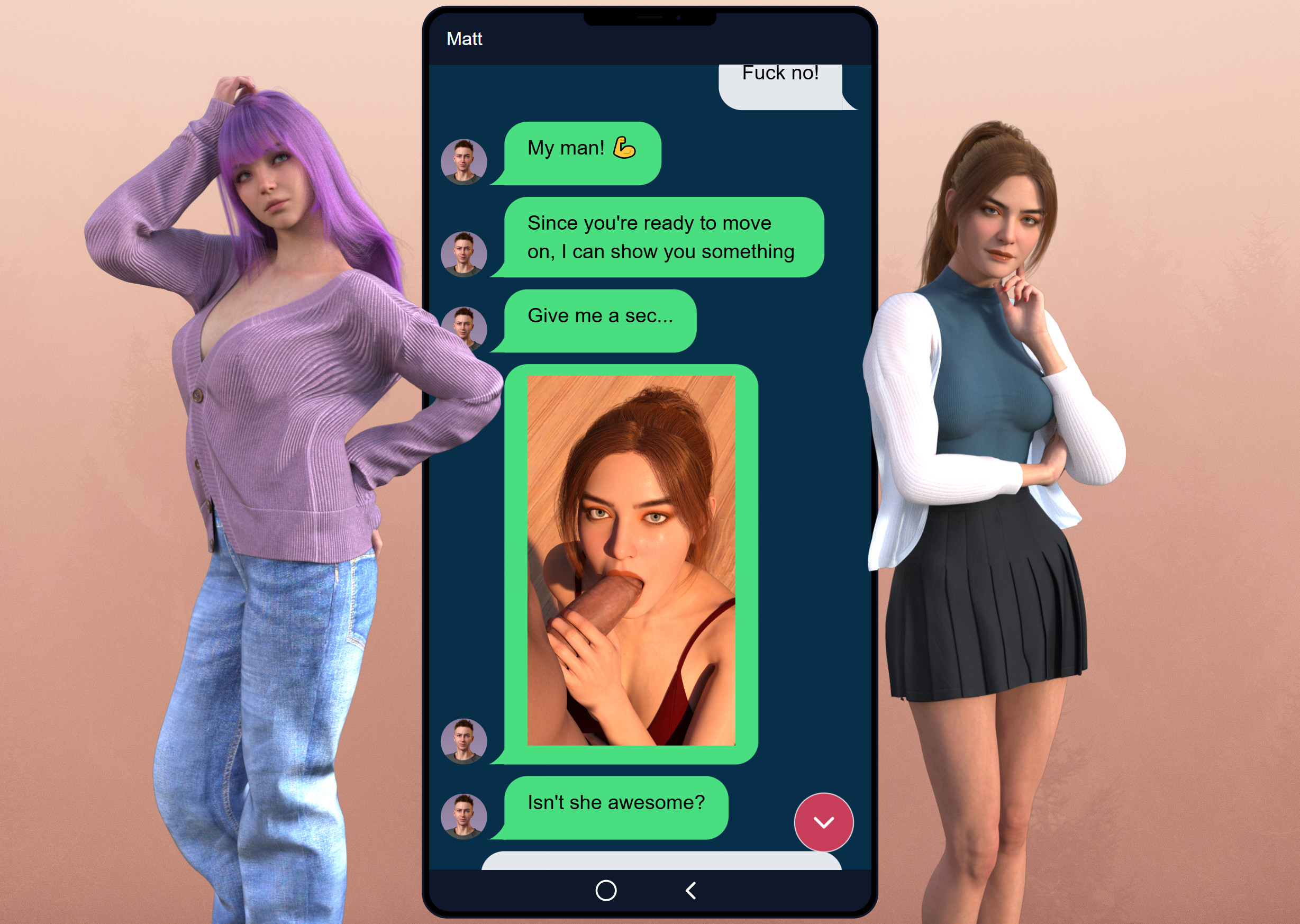 Engage in spicy, unpredictable chat sessions with friends, and new acquaintances in The Texting Game! Flirt with Nina, Lucy, and other characters as your best friend pulls you into morally ambiguous situations, unlock explicit photos while exploring kinks and discovering fun twists. It's like a real chat but with way more excitement —your messages could lead to anything!